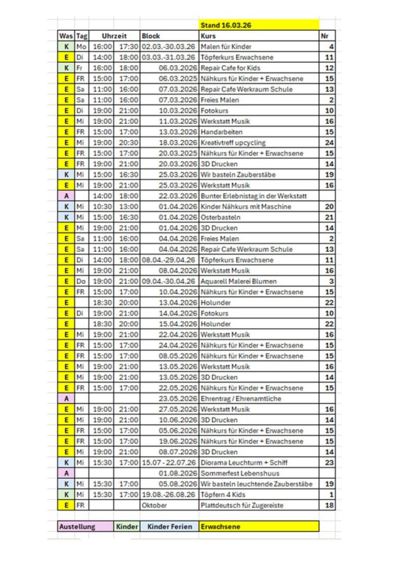 Anmeldung und Kontakt zu allen Kursen:Karin Kerkau Tel.: 04944 - 2559 oder Mail: workshop@kultur-wiesmoor.de